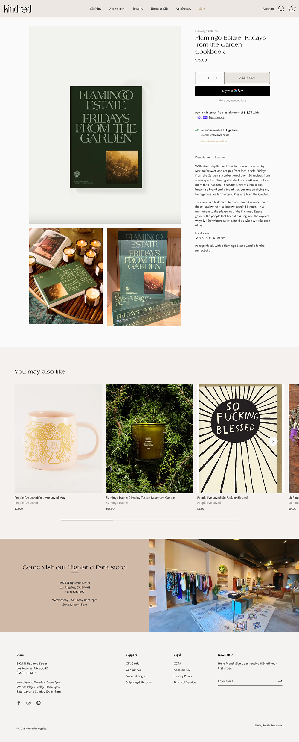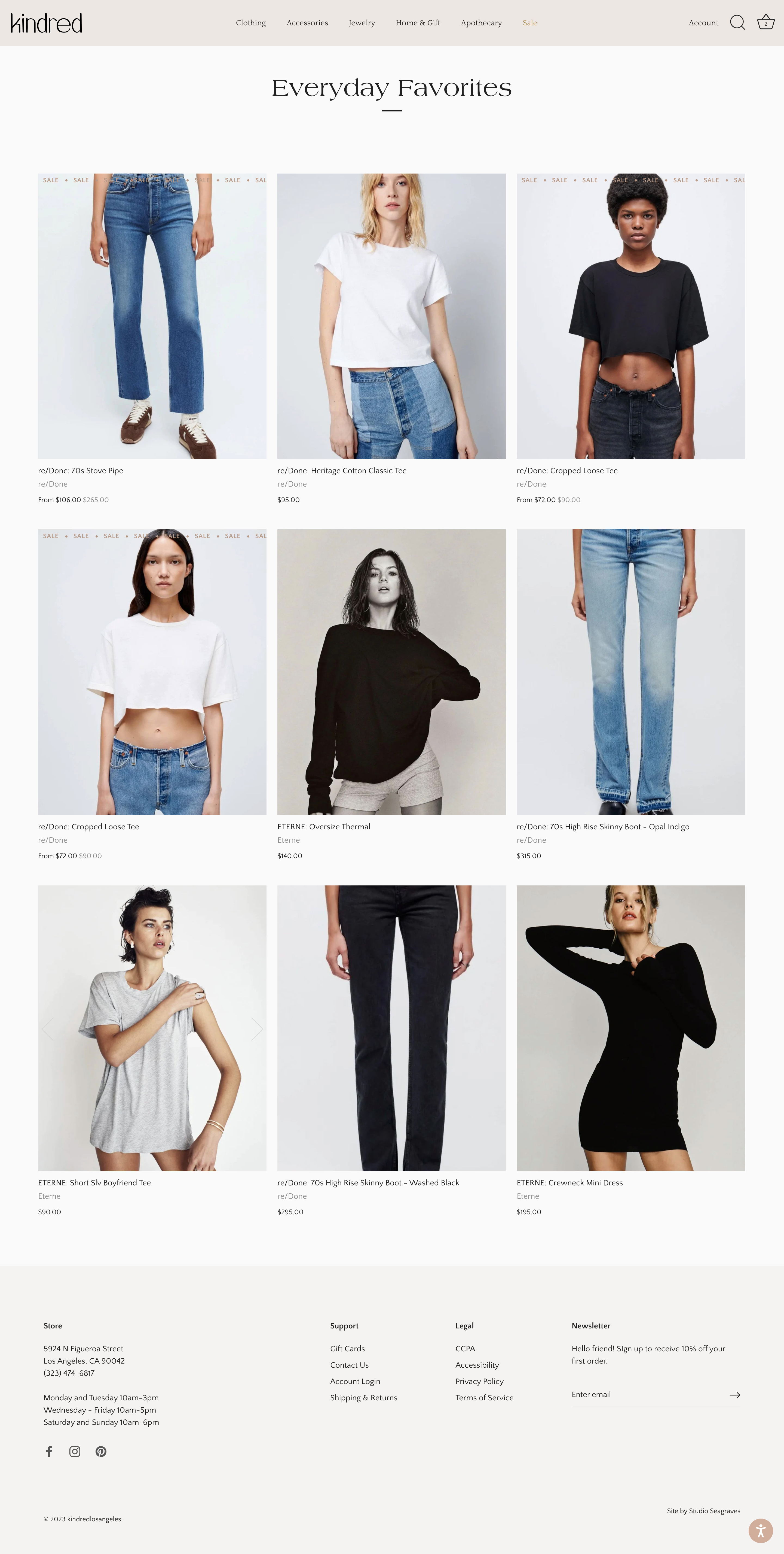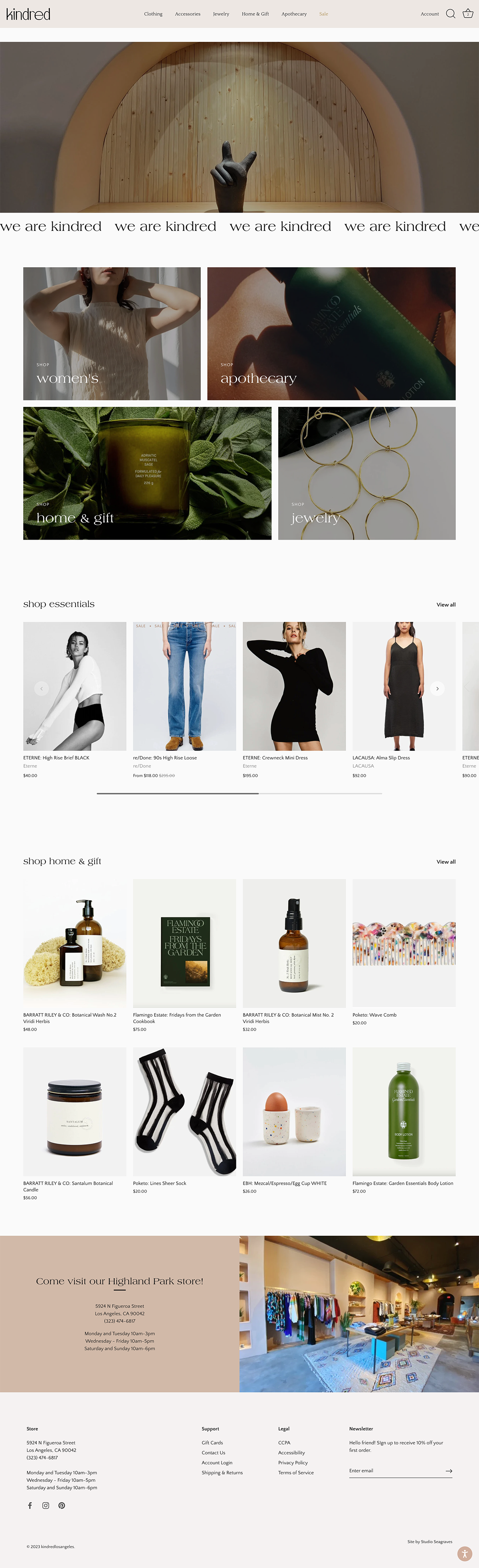 Kindred is a Los Angeles-based clothing, accessories and home decor store based in the Highland Park area. The brick and mortar carries cool indie brands with a laid back vibe. Owners Jen & Sarah wanted a website to reflect their store and vibe. Studio Seagraves was hired to design their website and optimize with the latest apps and integrations.